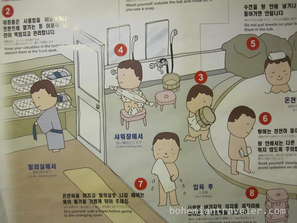 Társadalmilag nem elfogadott, ha valaki koszosan, vagy kemikáliával szennyezetten (habosan, samponosan stb) megy a forrásvízbe, így ezen a ponton érdemes egy pillanatra megállni és alapos ellenőrzést végezni. Mivel a kézi törölközőt mosakodó kendőként használják a japánok, így a tisztálkodást követően az már tisztátalannak számít. Ez a magyarázata annak, hogy a fürdő további részében legfeljebb csak testrész takarásra használják, de semmiképpen nem teszik bele a forrásvízbe.