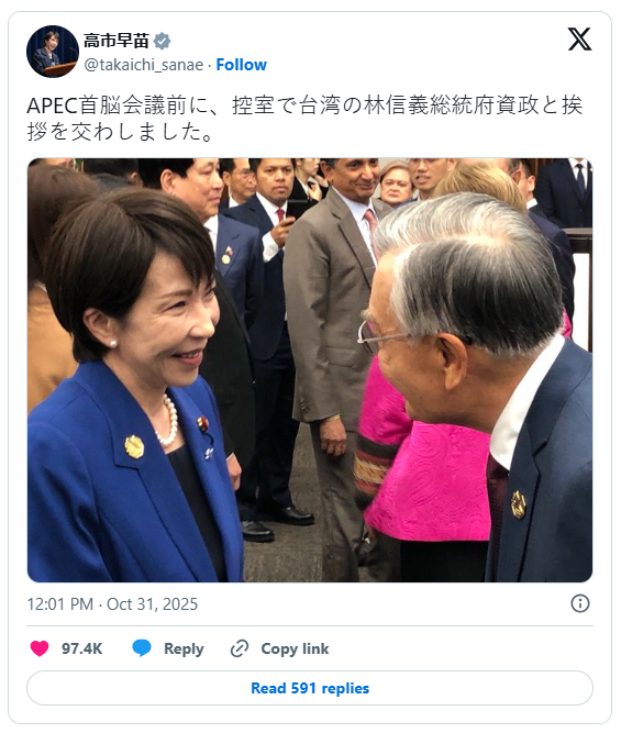 A kínai diplomata, Hszue Csian posztját ugyan gyorsan törölték az X-ről, Tokió mégis azonnal, de visszafogottan "rendkívül helytelennek" nevezte a bejegyzést, amelynek egyértelmű címzettje Japán október végén megválasztott első női miniszterelnöke volt.